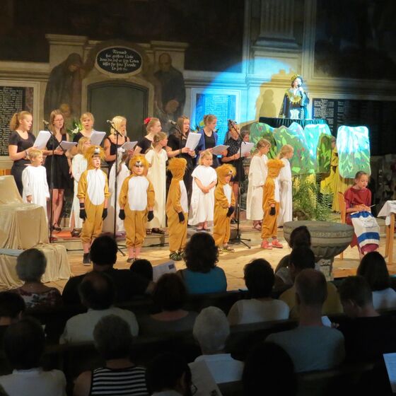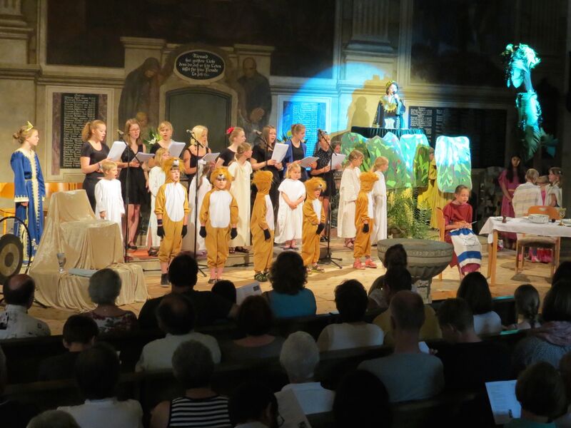 Wir treten auf bei großen Kindermusicals und machen mit bei Gottesdiensten für die ganze Familie. Jedes Jahre im Sommer führen wir unser großes Kinderchor-Musical auf: In bunten Kostümen, mit Kulissen und einem kleinen Orchester erleben wir spannende Abenteuer vor großem Publikum.